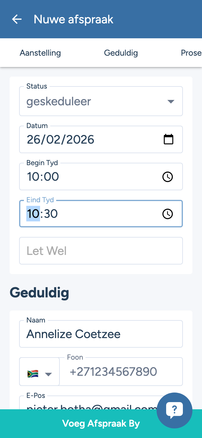 Verminder versuim-opdaag met outomatiese SMS- en e-posherinneringe. Ons intelligente skeduleringstelsel optimaliseer stoeltyd en voorkom dubbele besprekings terwyl pasiënte aanlyn kan bespreek.