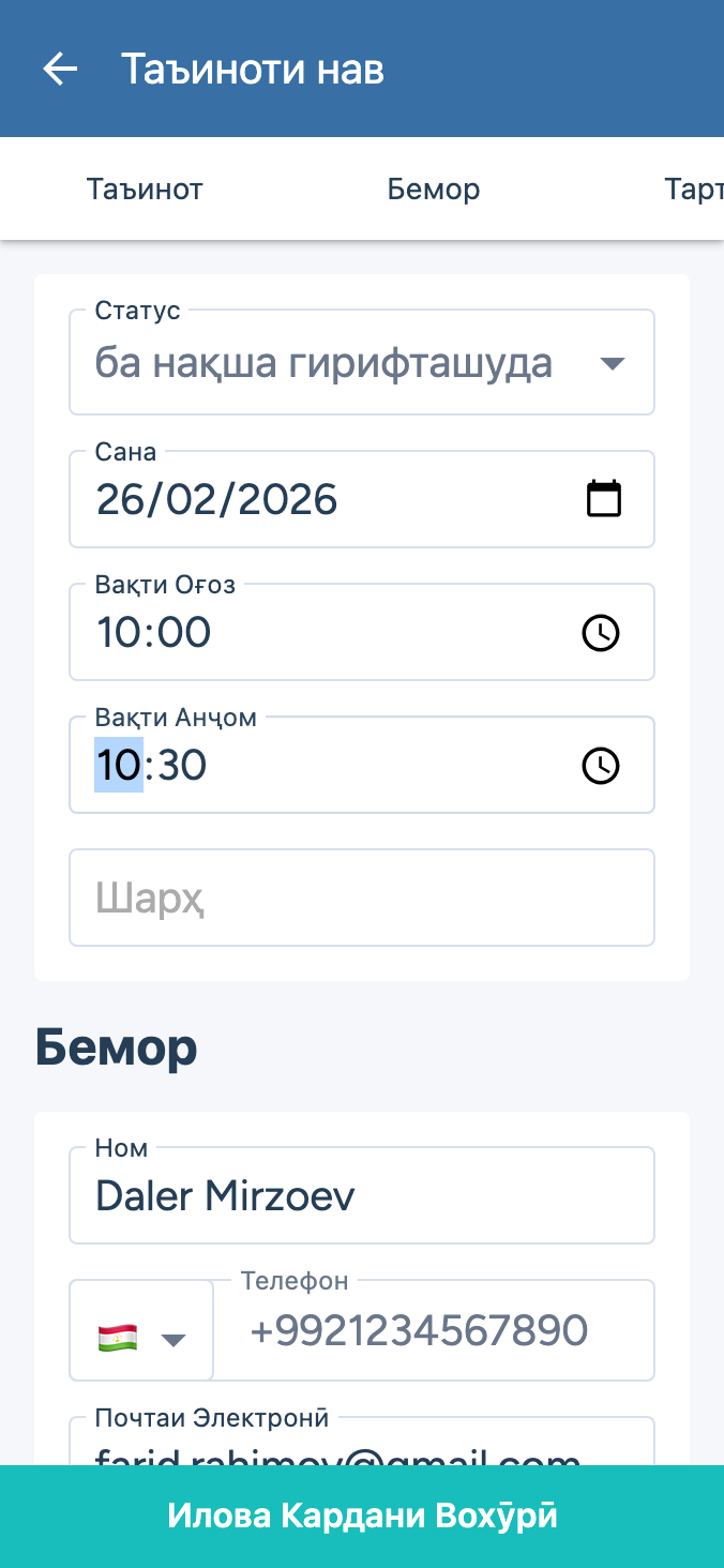 Вақти таъини вохӯриҳо, сабти табобатҳо, гирифтани қайдҳои клиникӣ ва идоракунии ҳисоббаробаркуниҳо аз як панели идоракунӣ. Ҷараёни кори мо аз ҷониби дандонпизишкон барои самаранокии ҳадди аксар тарҳрезӣ шудааст.